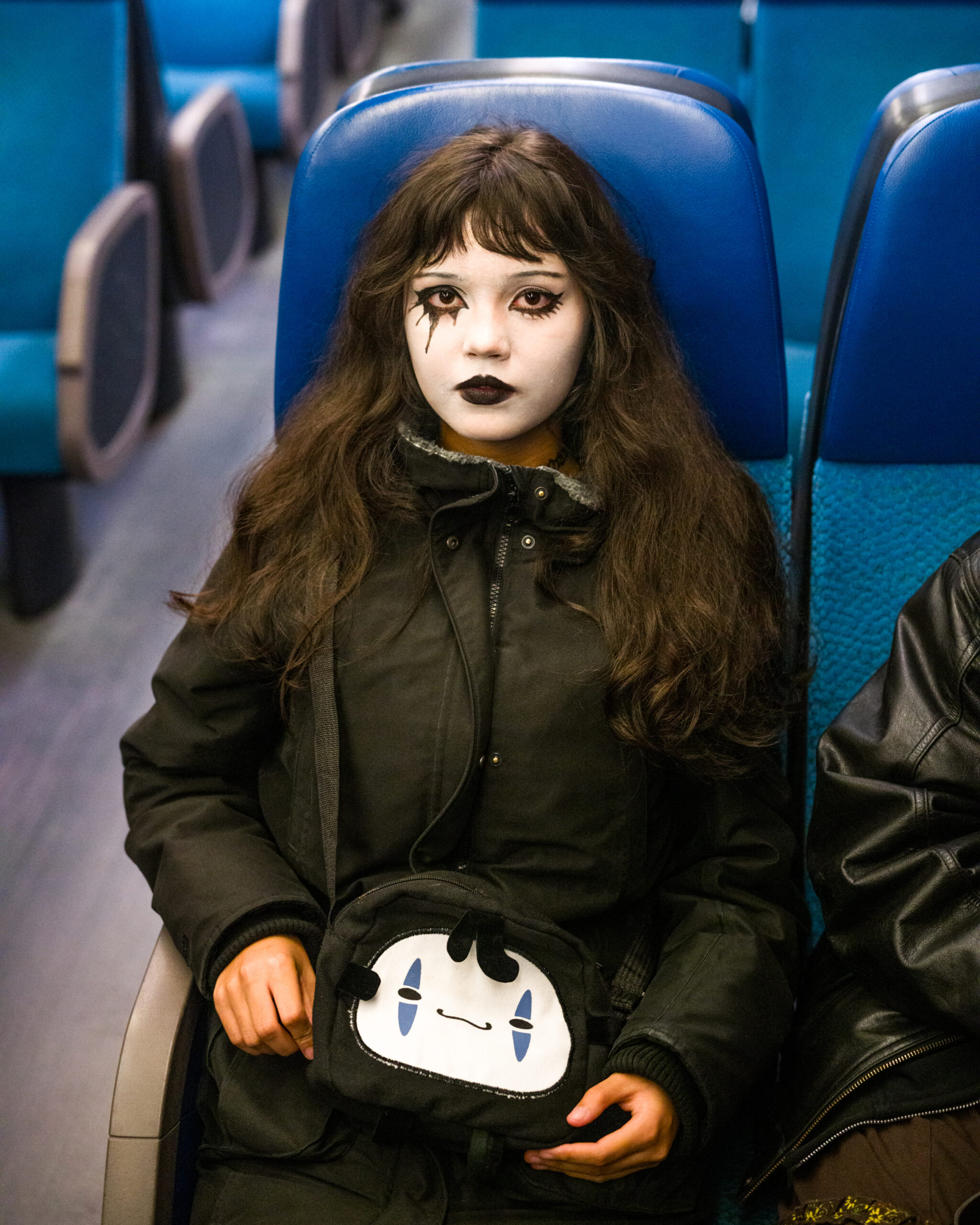 Phileine (17), met twee vrienden onderweg naar het feest GothVille in Rotterdam-Zuid 🦇 (Waar, volgens de flyer, de volgende muziekstijlen te horen zijn: new wave, dark wave, post punk, cold wave, synth wave, goth rock en death rock.)